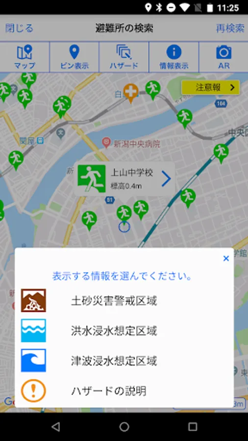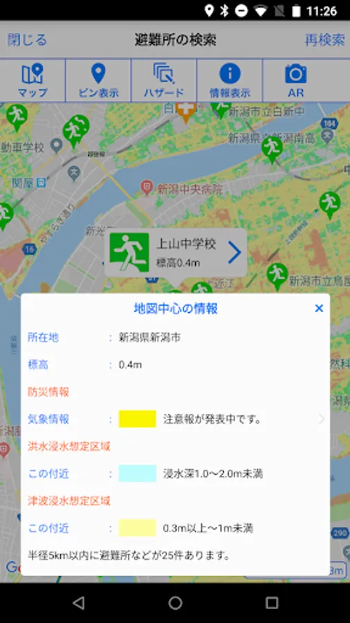 ・現在地周辺の指定避難所、指定緊急避難場所の自動検索