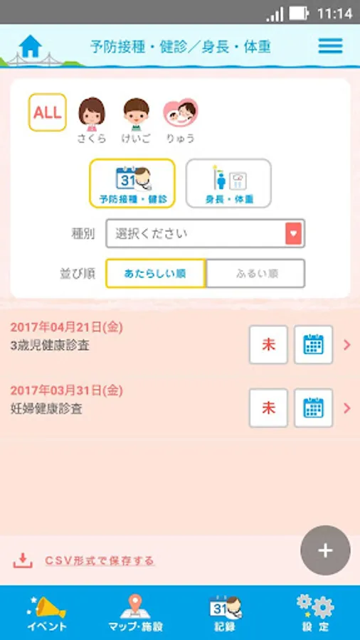 忘れがちな予防接種・検診の予定や、身長・体重を記録してみましょう