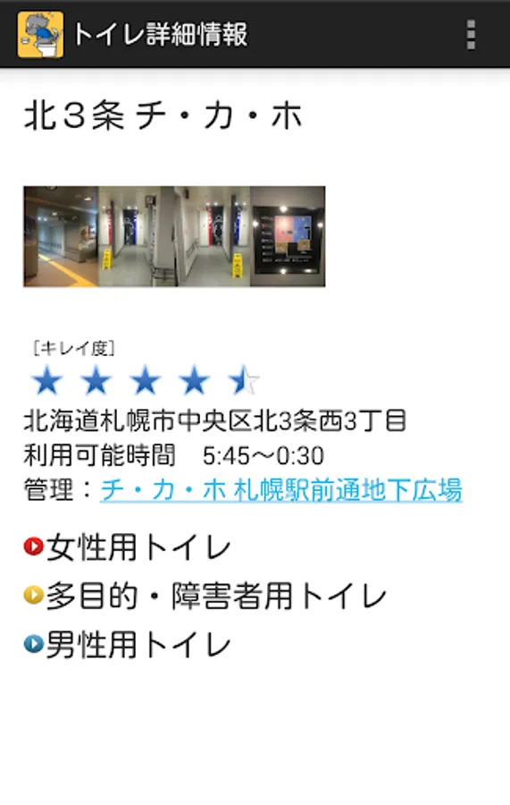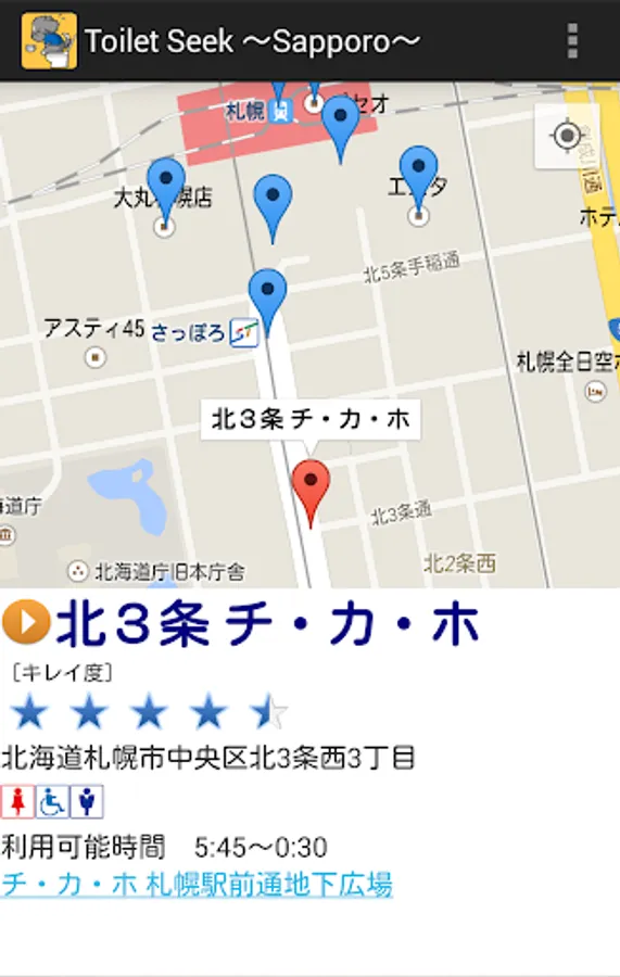 Toilet Seek ~Sapporo~ (below, toilet seek) is an application that provides detailed information about the beautiful toilet in the center of Sapporo. In the toilet seek, including the "beautiful degree," which evaluated its own company, bidet and wash basin, from the presence of facilities such as air towel, the cooperation in the management company like of each toilet, a picture of the toilet and gotten permission We are shooting to be published. Also sequentially additional toilet information future, so we will continue to update, please by all means available toilet seek.