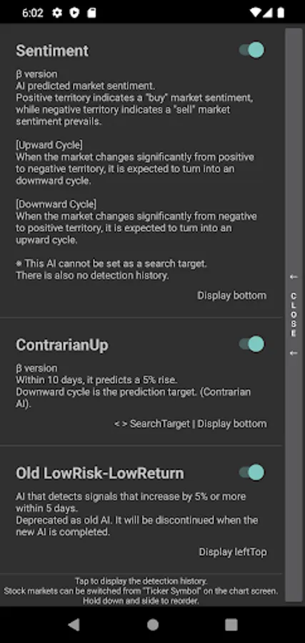 These include "Sentiment (buy vs. sell sentiment)" in the stock market and "Spike Signals" that tell you in advance that a stock will rise in the near future.