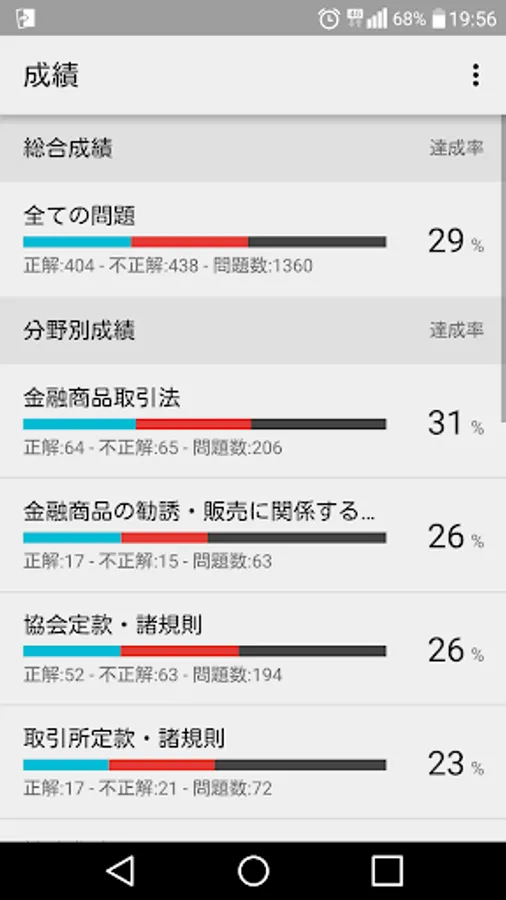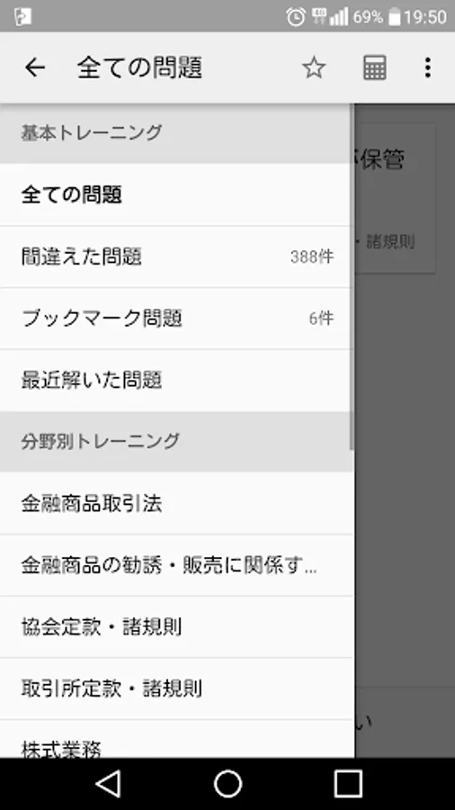 ・トレーニング(全問ランダム、間違えた問題、分野別等)