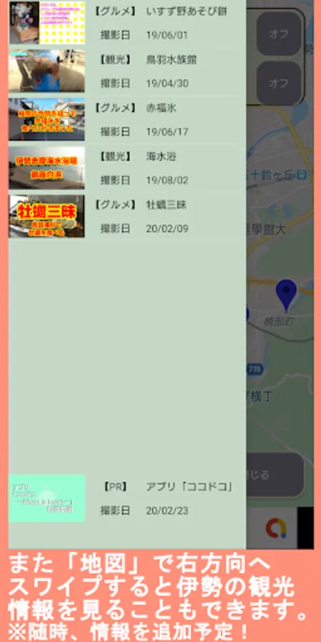 If you swipe right on the map screen, you can see a video of visiting 125 Ise Jingu companies and a video of sightseeing information around Ise on YouTube.