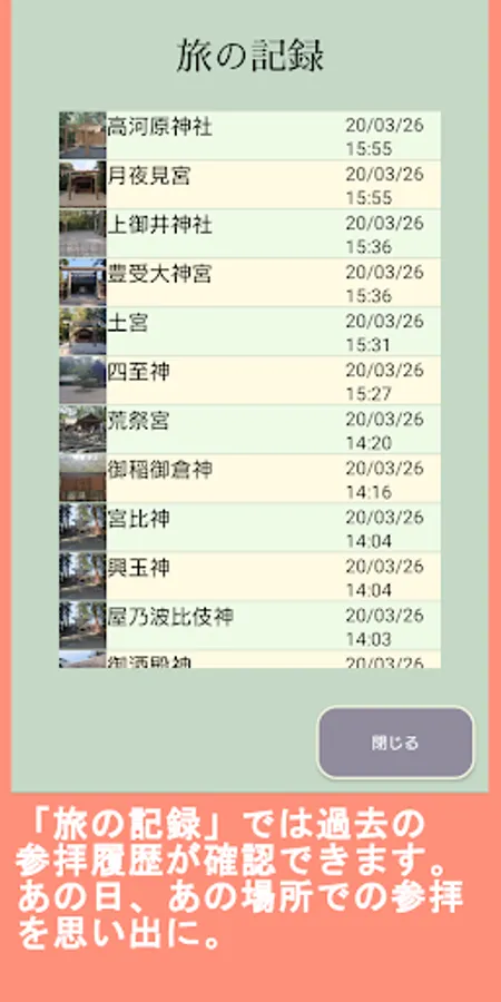 You can check the location, directions, detailed shrine information and worship history of 125 Ise Jingu shrines.
