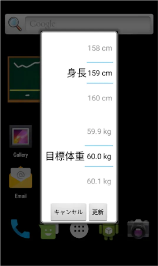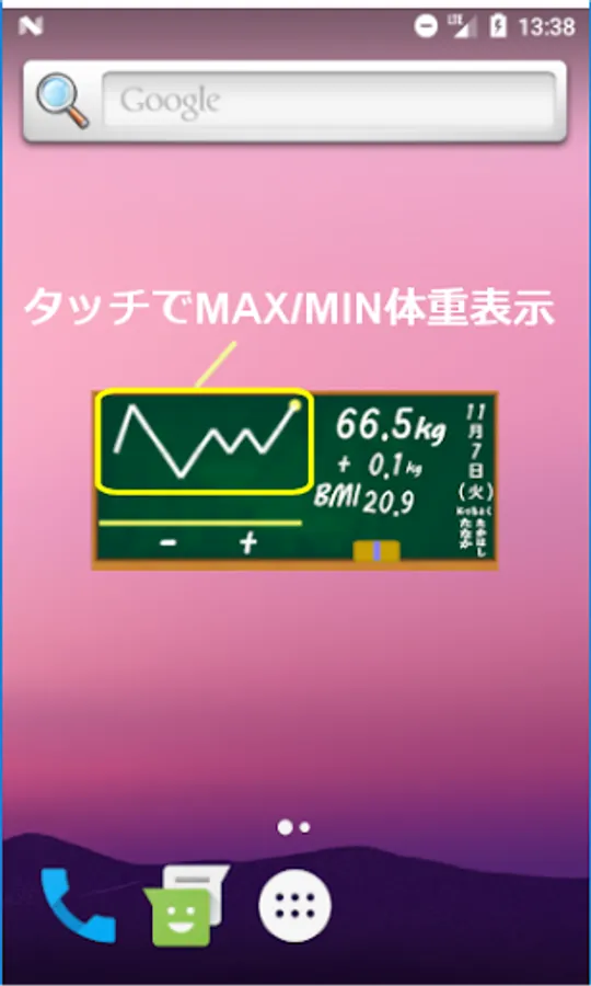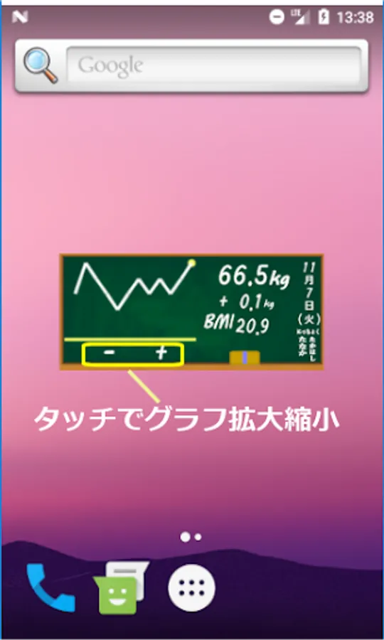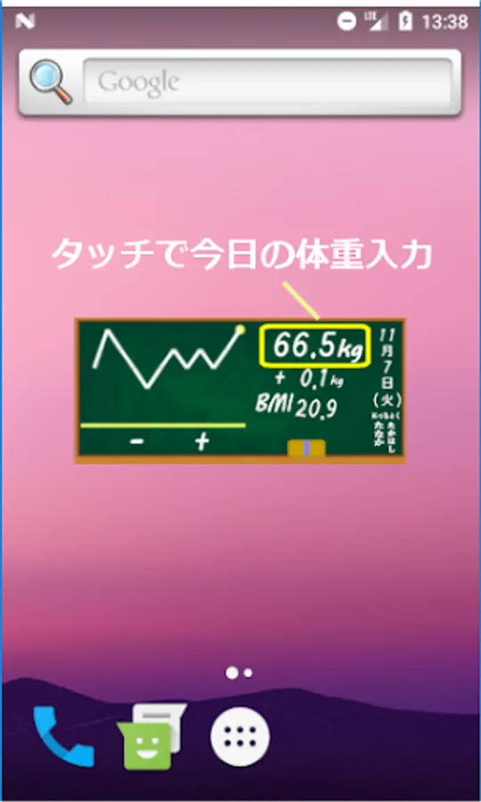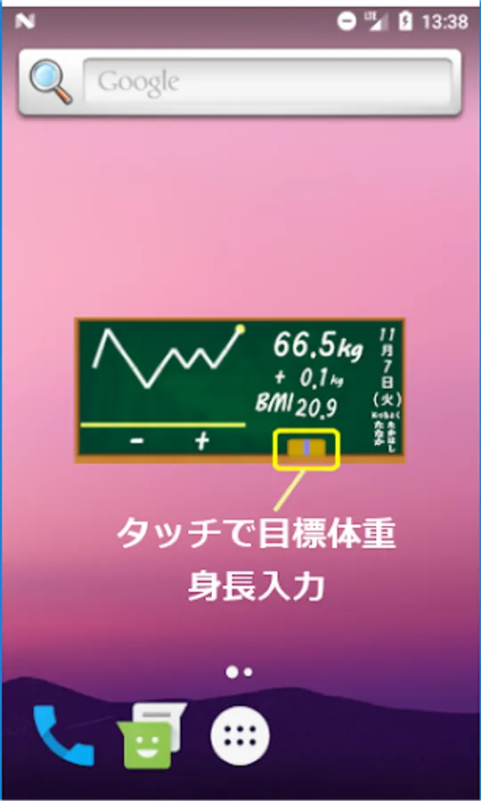 After installation, press and hold the home screen to display the widget and place the diet blackboard on the home. First, touch "Eraser" to set your height and target weight. After that, touch the current weight every day to update today's weight.