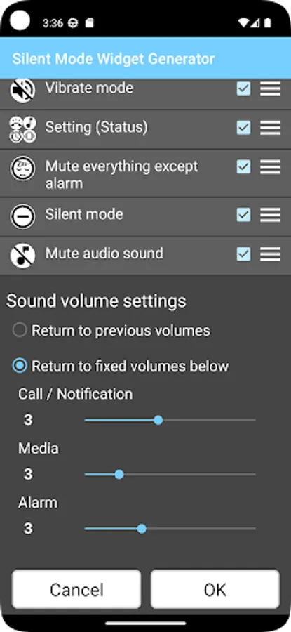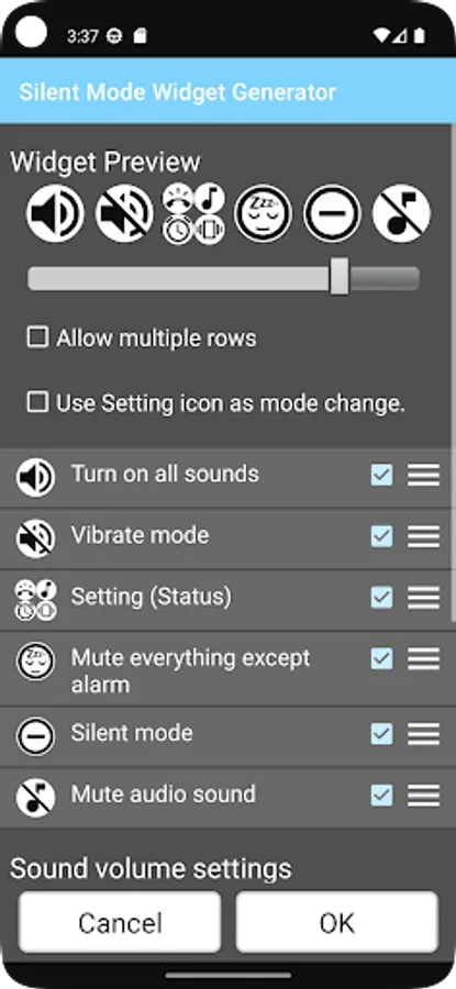 When the checkbox of "Use Setting icon as mode change" is checked, sound mode can be changed by this single icon.