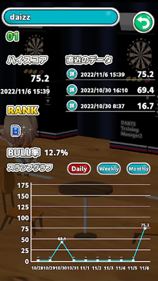 In addition to the score recording and slump graph functions that are indispensable for improving your darts, you can now analyze more detailed data such as the bull rate and rank!