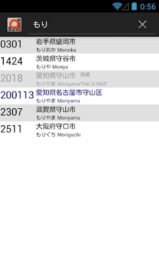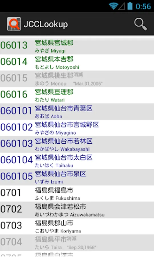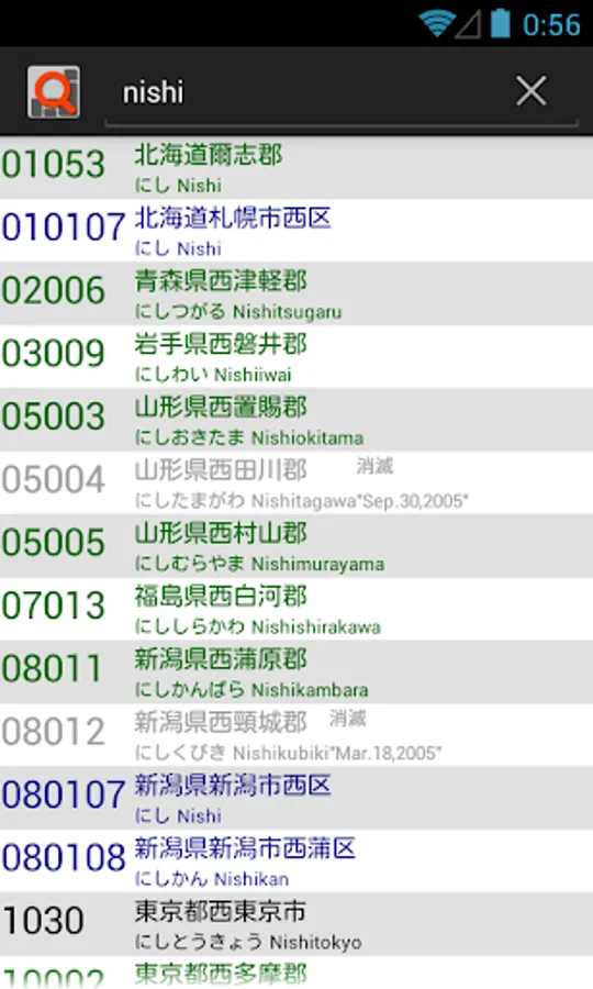 -Search: Search incrementally by JCC / JCG number, Kanji of ward name of prefecture city, hiragana reading, roman reading with first match.