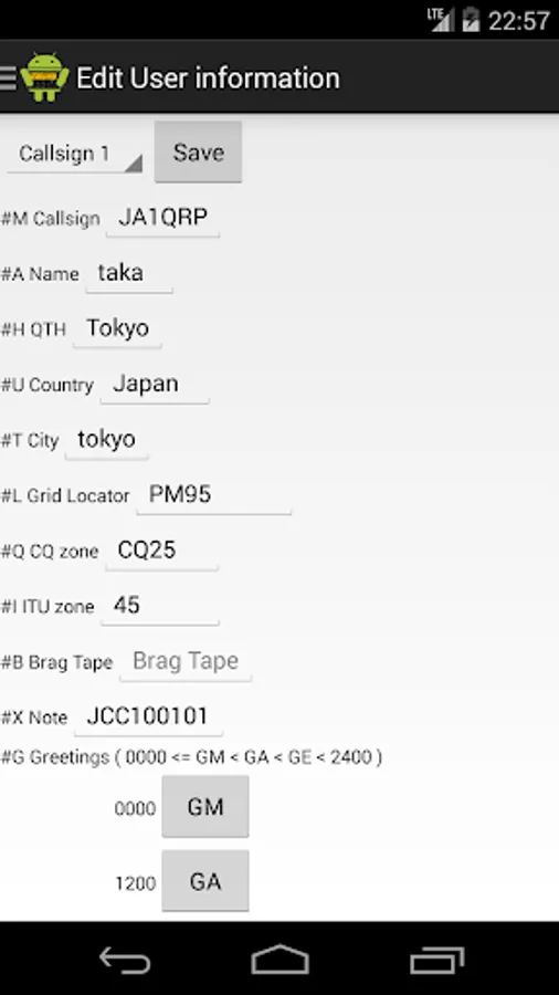 - I can be specified call sign, RST, user information, such as message macros are available.