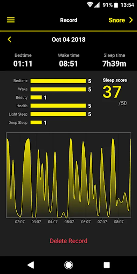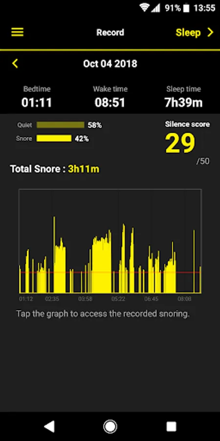 The time you snore and your "Silence Score", the state of keeping or being silent while sleeping, will be shown measured by the microphone on your phone. These "Silence Score" and the snoring time are available without the recording function. If you would like to listen your snoring, you need to record.