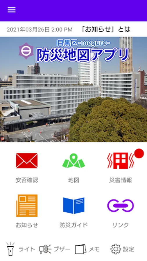 ・ Push notifications for notifications from Meguro Ward and information on disasters