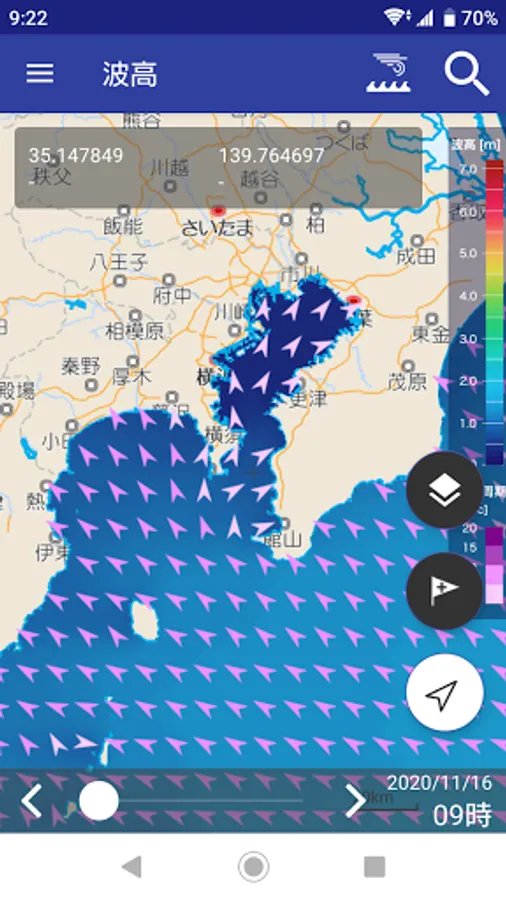 ・Displays actual/predicted data on wave height, wave direction, and wave cycle