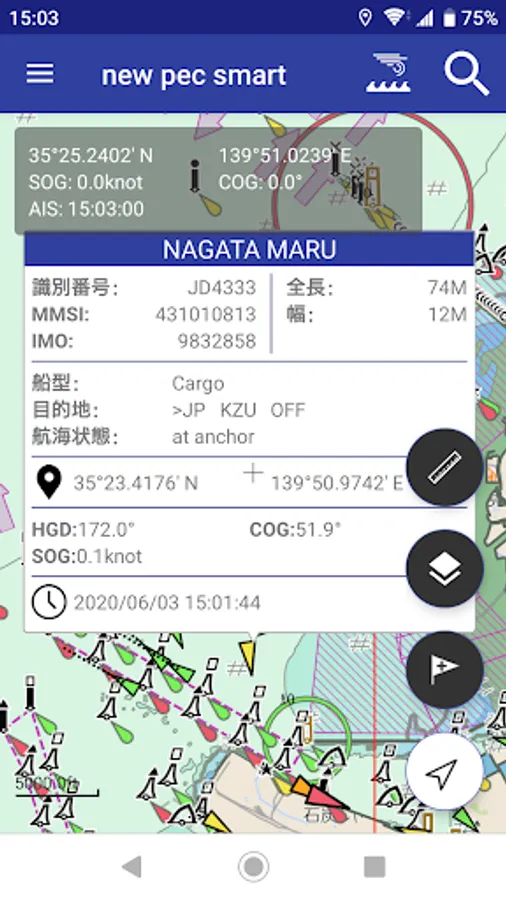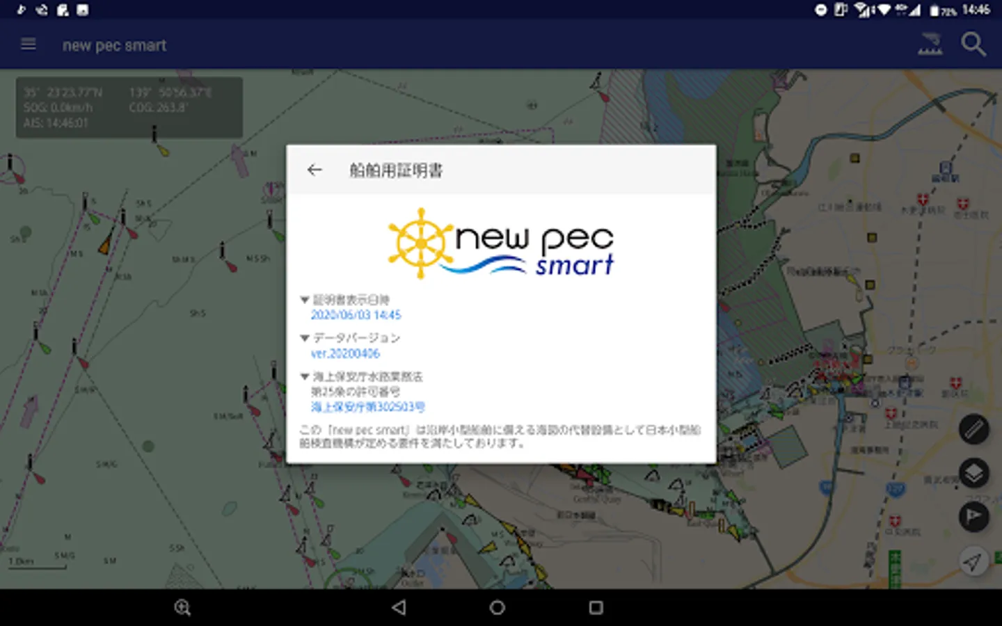 In June 2020, "new pec smar / Android version" received approval (*) from the Japan Small Craft Inspection Organization (JCI) as a legal fixture for small coastal vessels (alternative equipment for nautical charts).