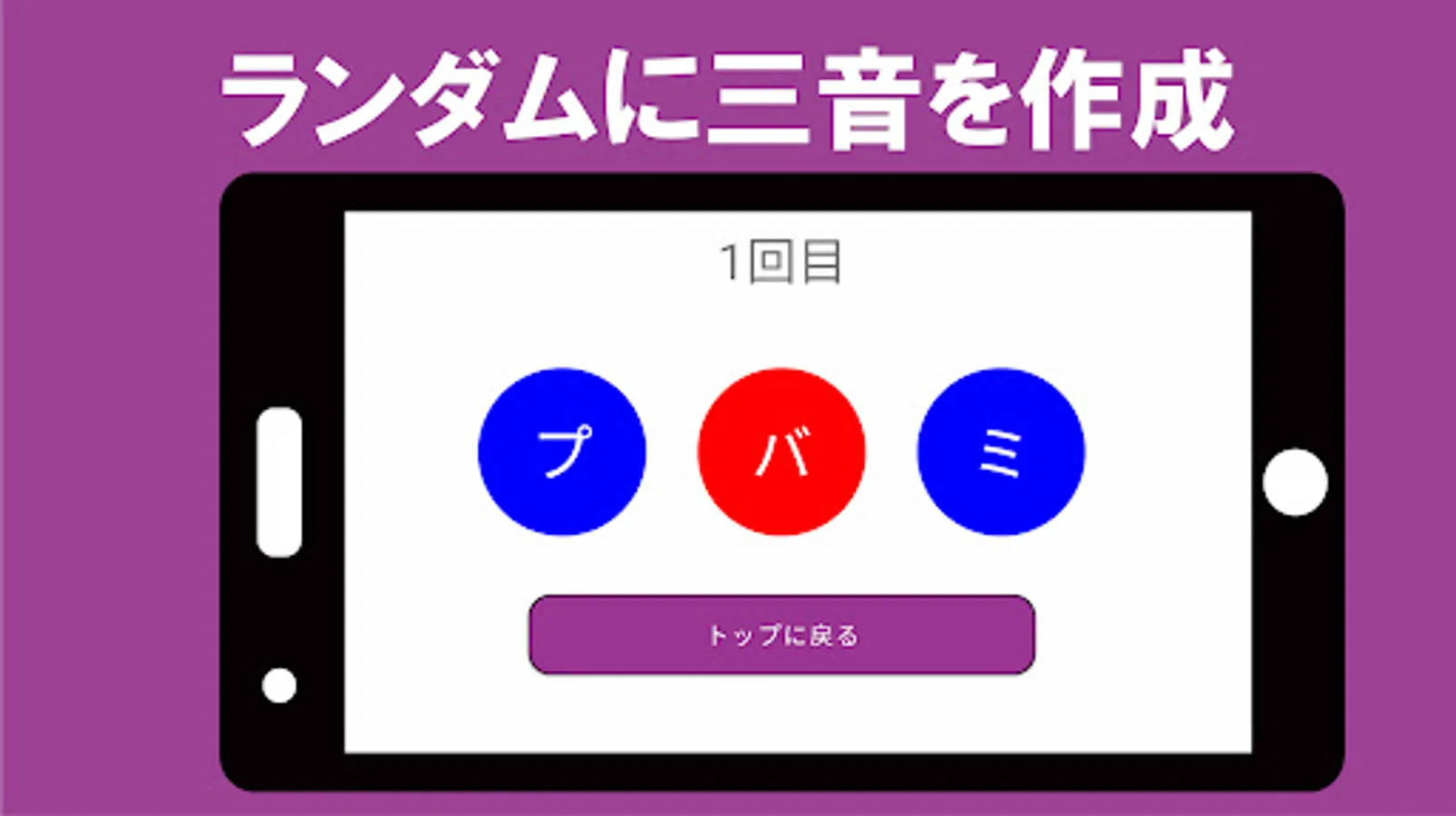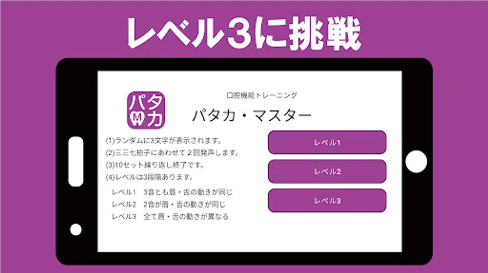 Oral frailty prevention app. Randomly generated three-letter meaningless syllable chain pronunciation training. Pataca vocalization up to level 3 in time with three and seven beats. Eat with your own teeth for the rest of your life.