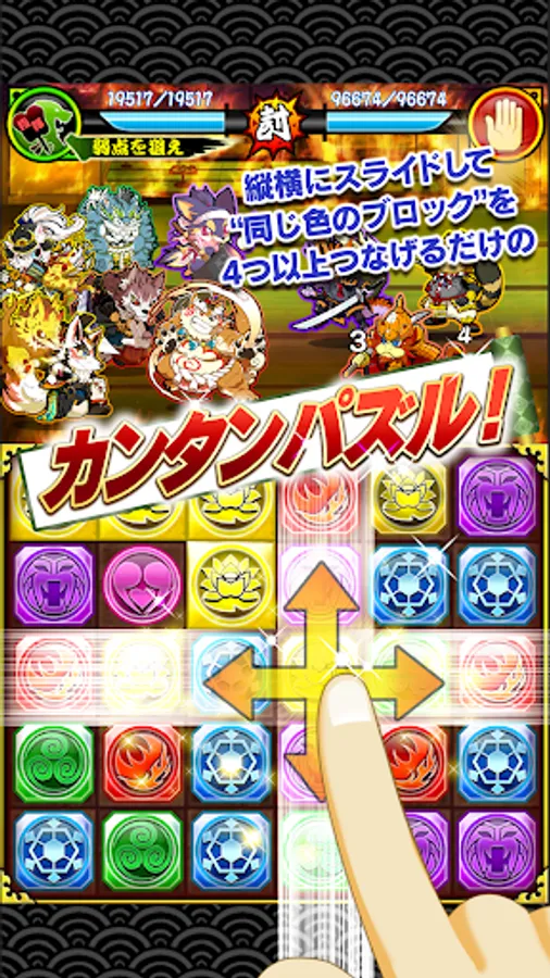 Yukimura Sanada the wolf, Ieyasu Tokugawa the raccoon dog, Goemon Ishikawa the frog... Create your own strongest unit from over 3,000 types of warlords and deal massive chain damage in puzzle battles! !