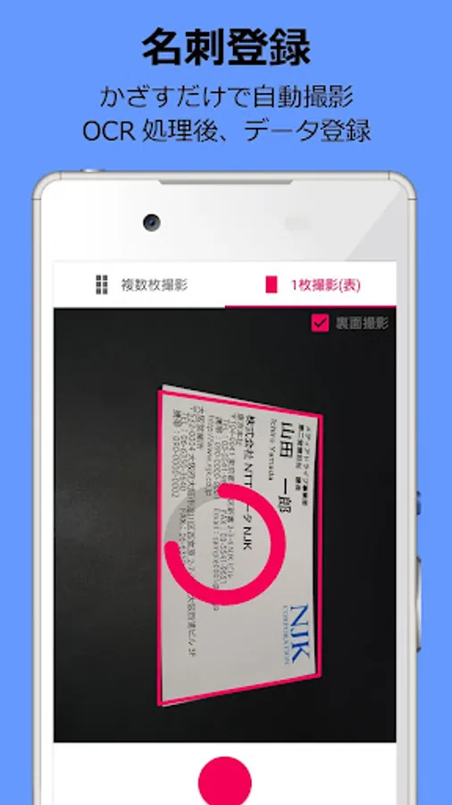 スマホを名刺にかざすだけで、自動でフォーカスを合わせて撮影するためタップによる撮影時の手ぶれを押さえます、