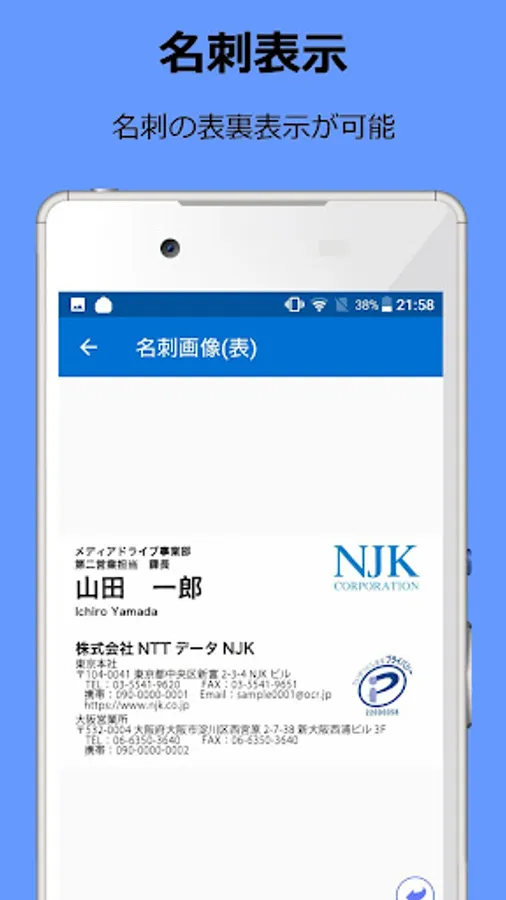 役職、氏名、社名および名刺のサムネイル表示をします。