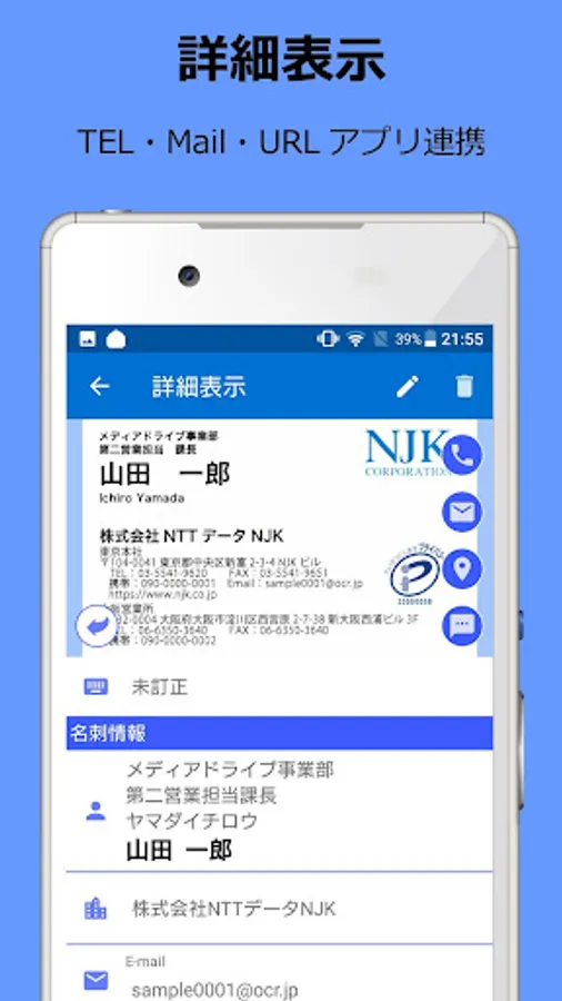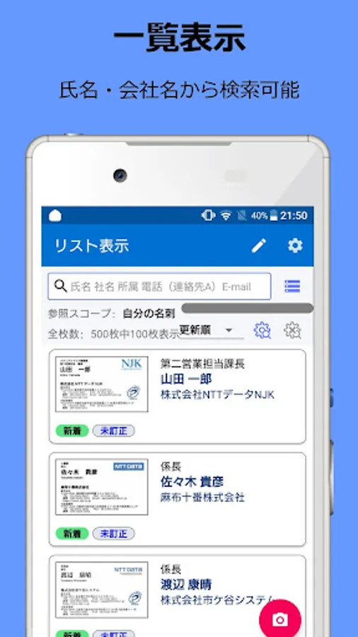 アプリ画面から直接クラウドの名刺データを、更新・編集・削除できます。