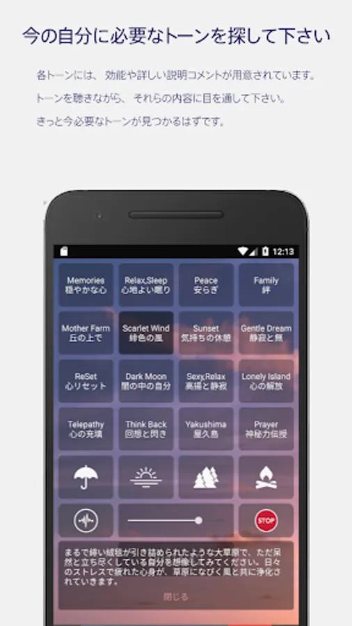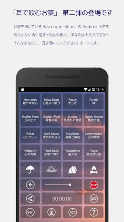 This app scientifically analyzes "music" and "voice" that have actually been found to be effective in clinical data of music therapy, and uses "tones" that are simulated and automatically generated by a unique analysis system. An unprecedented relaxation music playback application. Unlike the commonly called "healing music", it also contains rarely characteristic sounds and tunes.