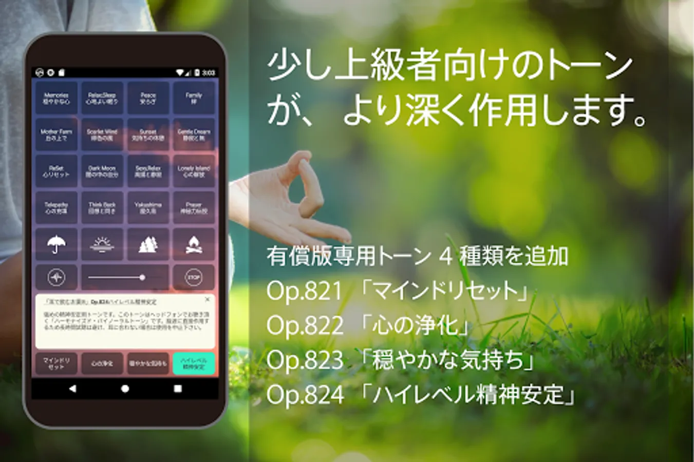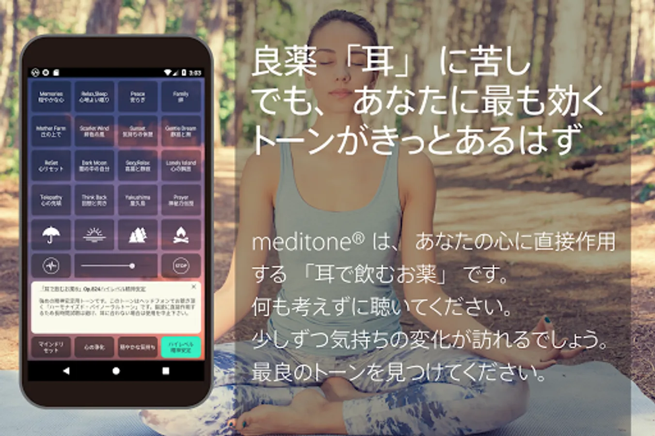 This app scientifically analyzes "music" and "voice" that have actually been found to be effective in clinical data of music therapy, and uses "tones" that are simulated and automatically generated by a unique analysis system. An unprecedented relaxation music playback application. Unlike the commonly called "healing music", it also contains rarely characteristic sounds and tunes.