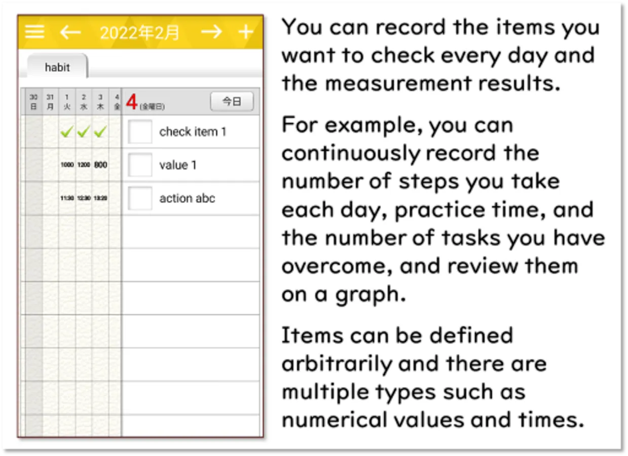 ・ We support confirmation and recording so that you do not forget what you want to make a habit or check in your daily life.