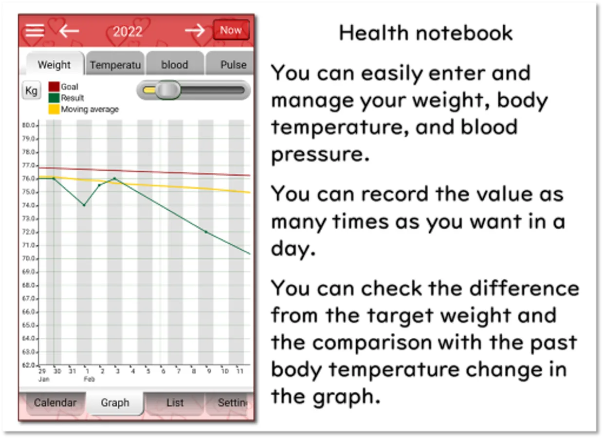 ・ You can easily record your daily weight, body temperature, blood pressure, pulse, body fat percentage, and condition.