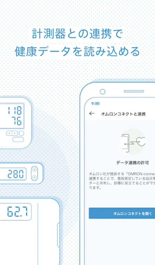 オムロンヘルスケアの通信機能付き健康機器により収集した血圧・体重・活動量のデータと、本アプリに搭載されている問診機能から、傷口の状態・体調・気分・食事状況・服薬状況等のデータを収集します。アプリを通じてこれらの患者のPHRを医療機関と情報共有し、外来診察時に主治医が活用します。