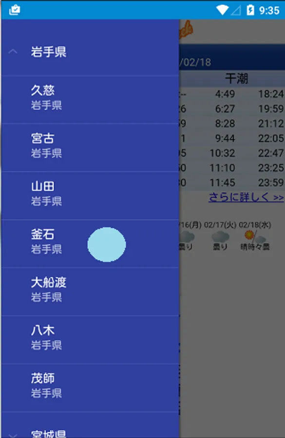 右にスワイプし、都道府県→港を選択し、潮見表を表示します。