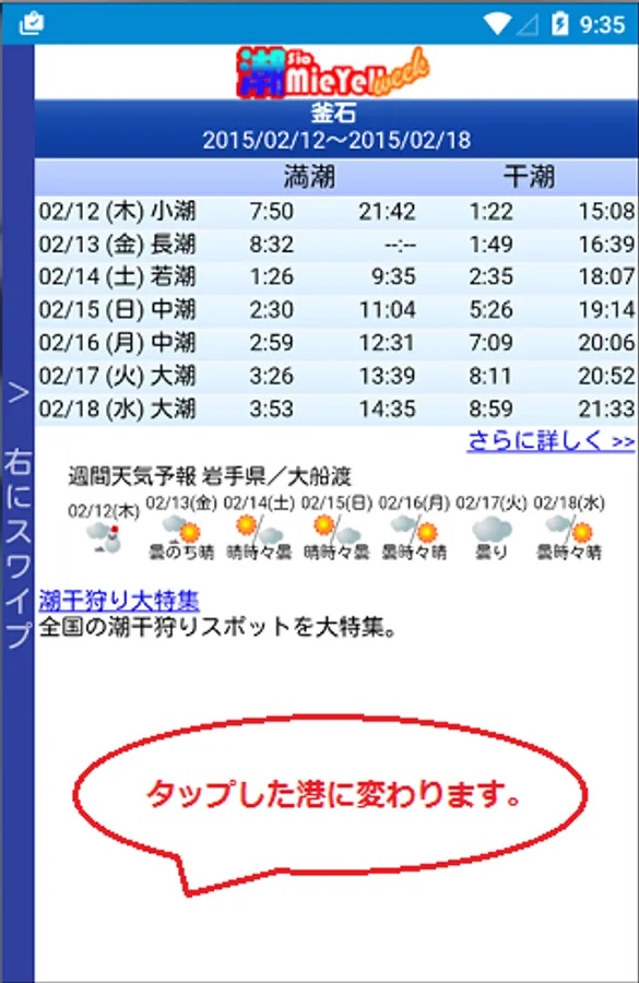 ★日本全国712港の中から指定した港の一週間分の潮見表と天気予報を表示します。