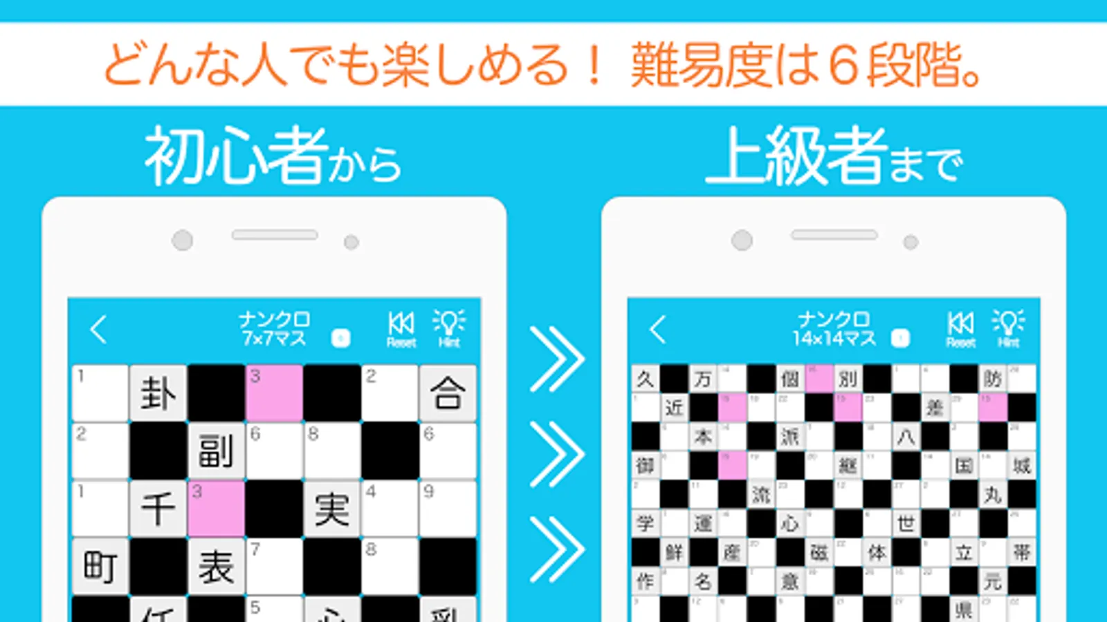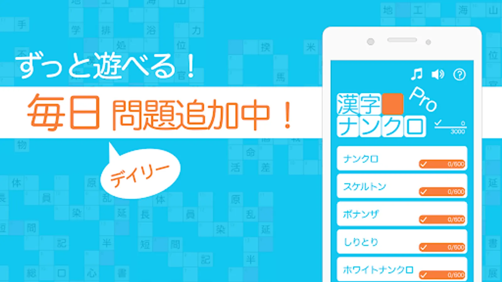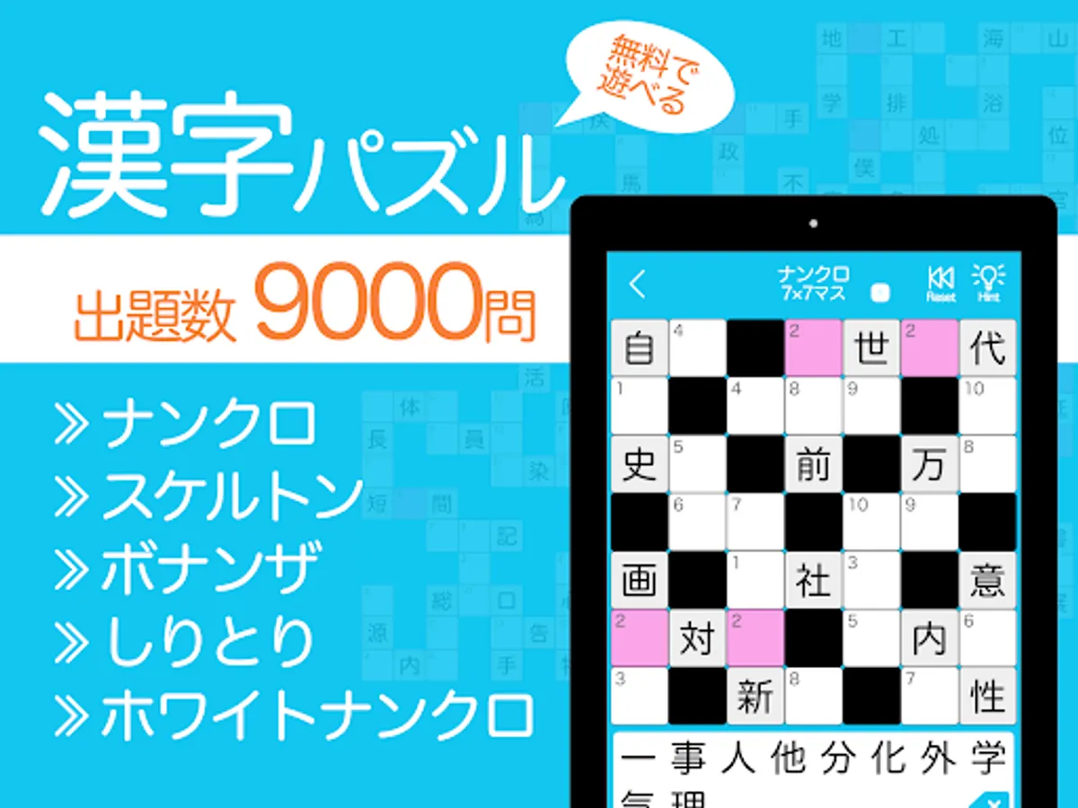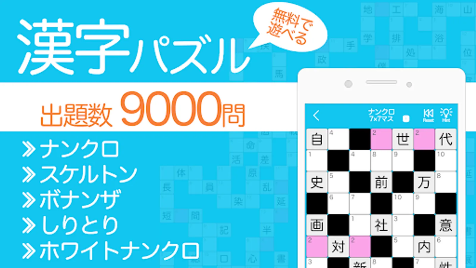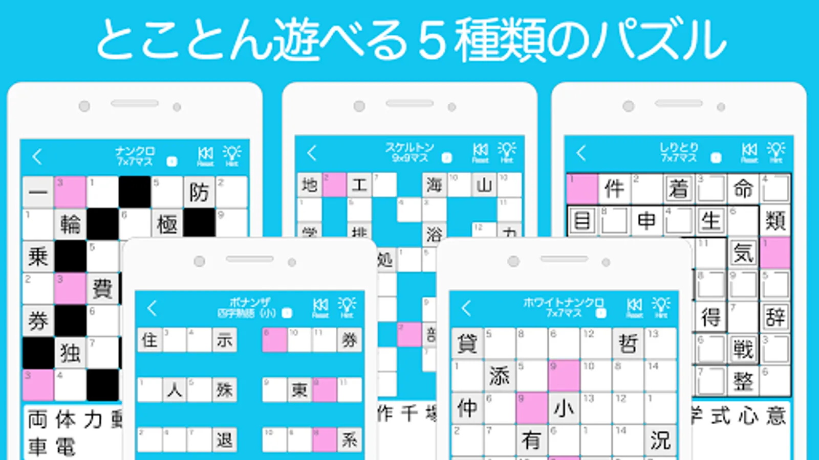 There are 5 types of kanji puzzle games. In addition to the popular kanji nankuro in magazines, there are also skeletons, bonanzas, kanji shiritori, and rare white nankuro. There are 6 levels of difficulty for each puzzle.