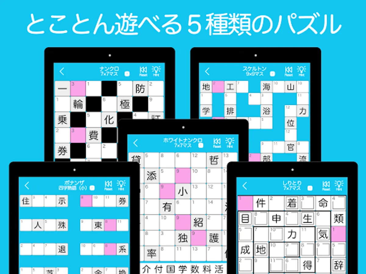 Each puzzle is a popular kanji game that fills the squares on the board with kanji. The rules are slightly different, so you can do brain teaser from various angles.
