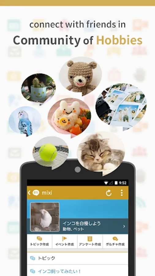Mixi is a social networking service where everyone can talk about their own hobbies.