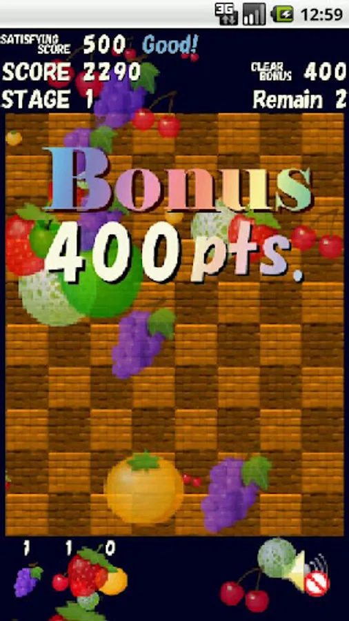 You can proceed to the next stage in the case of more than "SATISFYING SCORE" a score of at the finish stage. You can get bonus score depending on the number of remaining fruits.