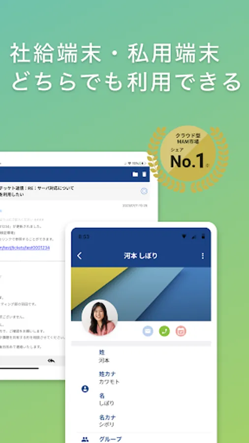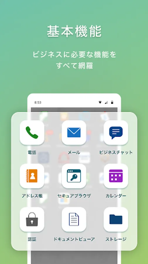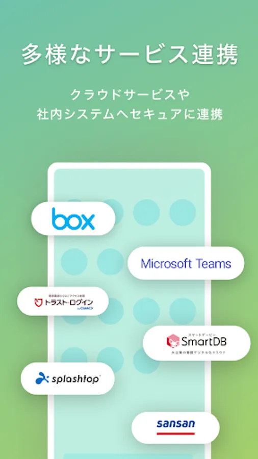 By linking with various cloud services and on-premise systems, it realizes safe use of mail/schedule/address book (business card management)/telephone/CRM/SFA/file storage/various web applications.