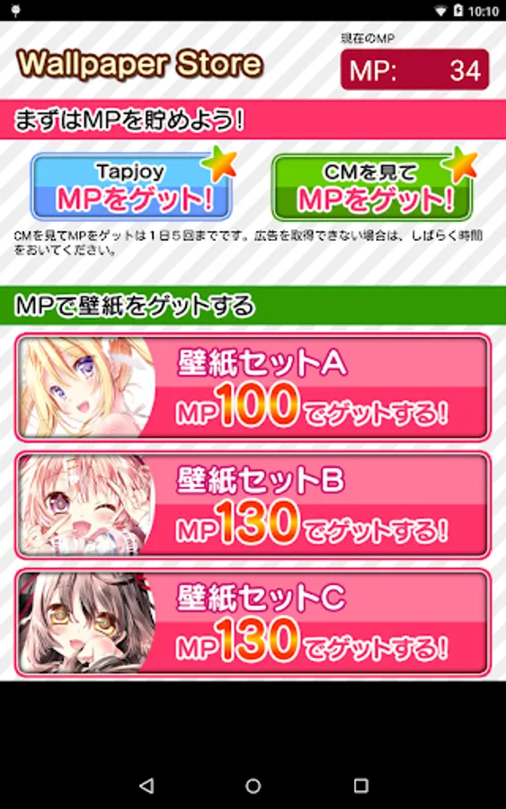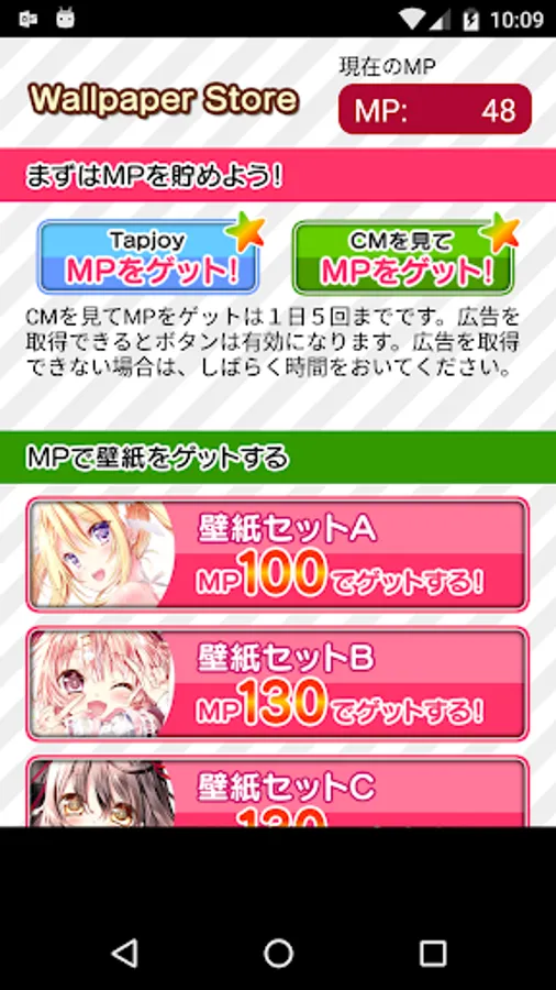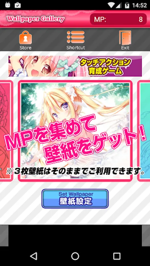 You can use 3 wallpapers, clock widgets, icons for free. Other Wallpapers should be purchased with point(MP), in-app billing.
