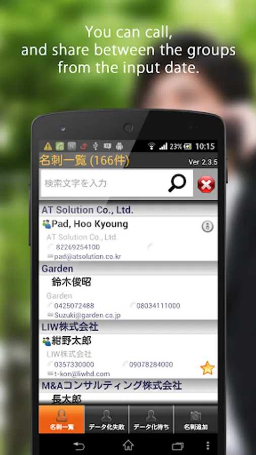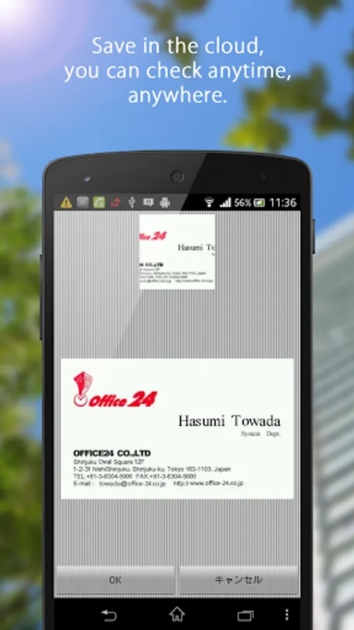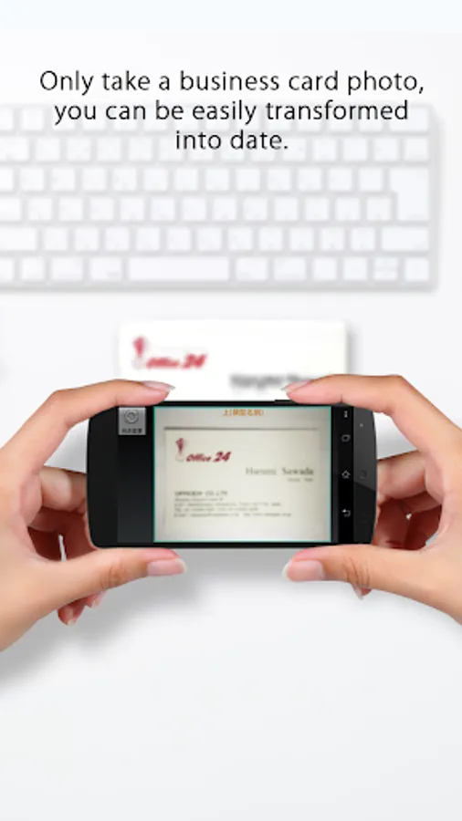 Import and save your business card using Android device. Scanned and OCRed your business cards, you can edit, read, delete, and manage your data of these cards through MOT/Bizcard or your browser.