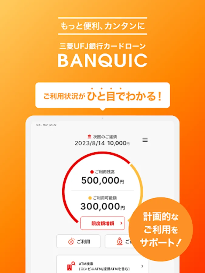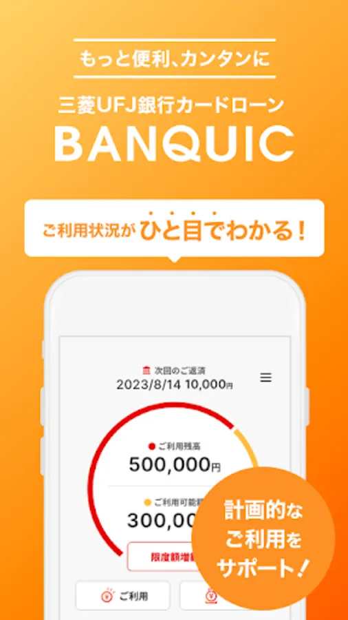 ・Immediate confirmation of important information such as "Balance", "Available amount", "Next repayment date", "Next repayment amount", "Notice from Banquick", etc., supports planned use.