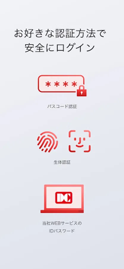 You can use passcode authentication, biometric authentication, DC Web service ID / password each time, and a secure login method that suits you.