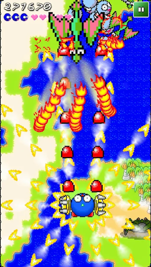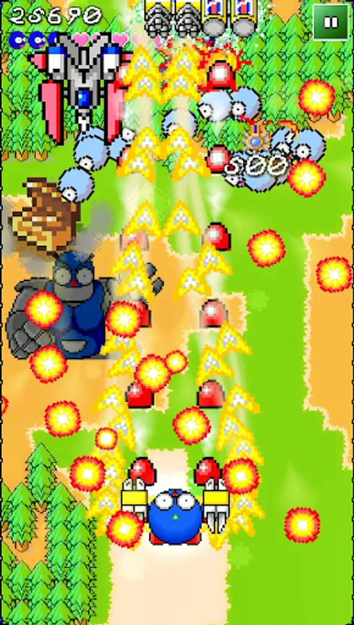 Select a stage and difficulty. Use the directional controls to avoid enemy bullets, and shoot down enemies using the attack button. Collect your friends to boost your score, and shoot at present boxes to switch to better weapons every now and then. When you see a flash on the ground, dig up the treasure, and if you get bombarded with enemy shots then use your precisions controls to slowly dodge them. Don't forget to 'pause' if you get tired.