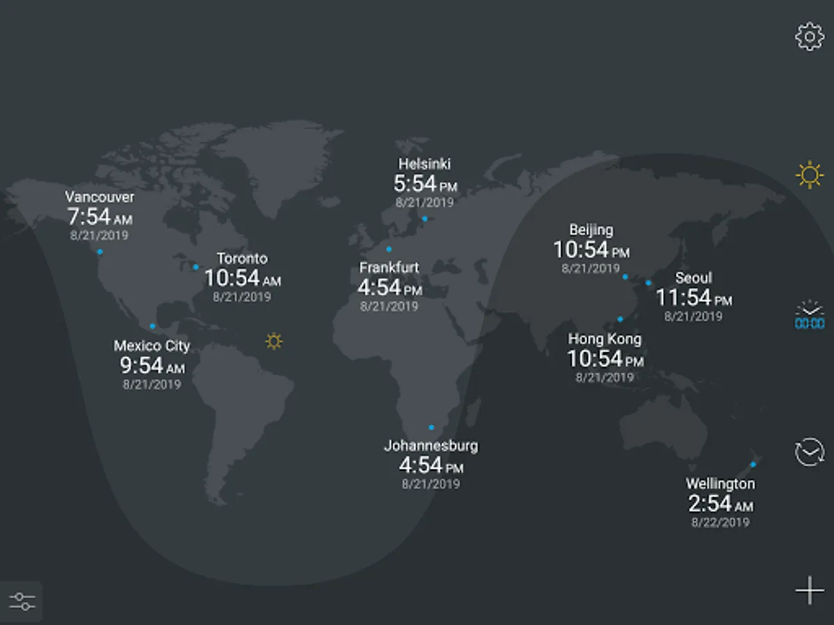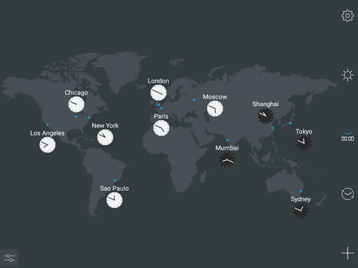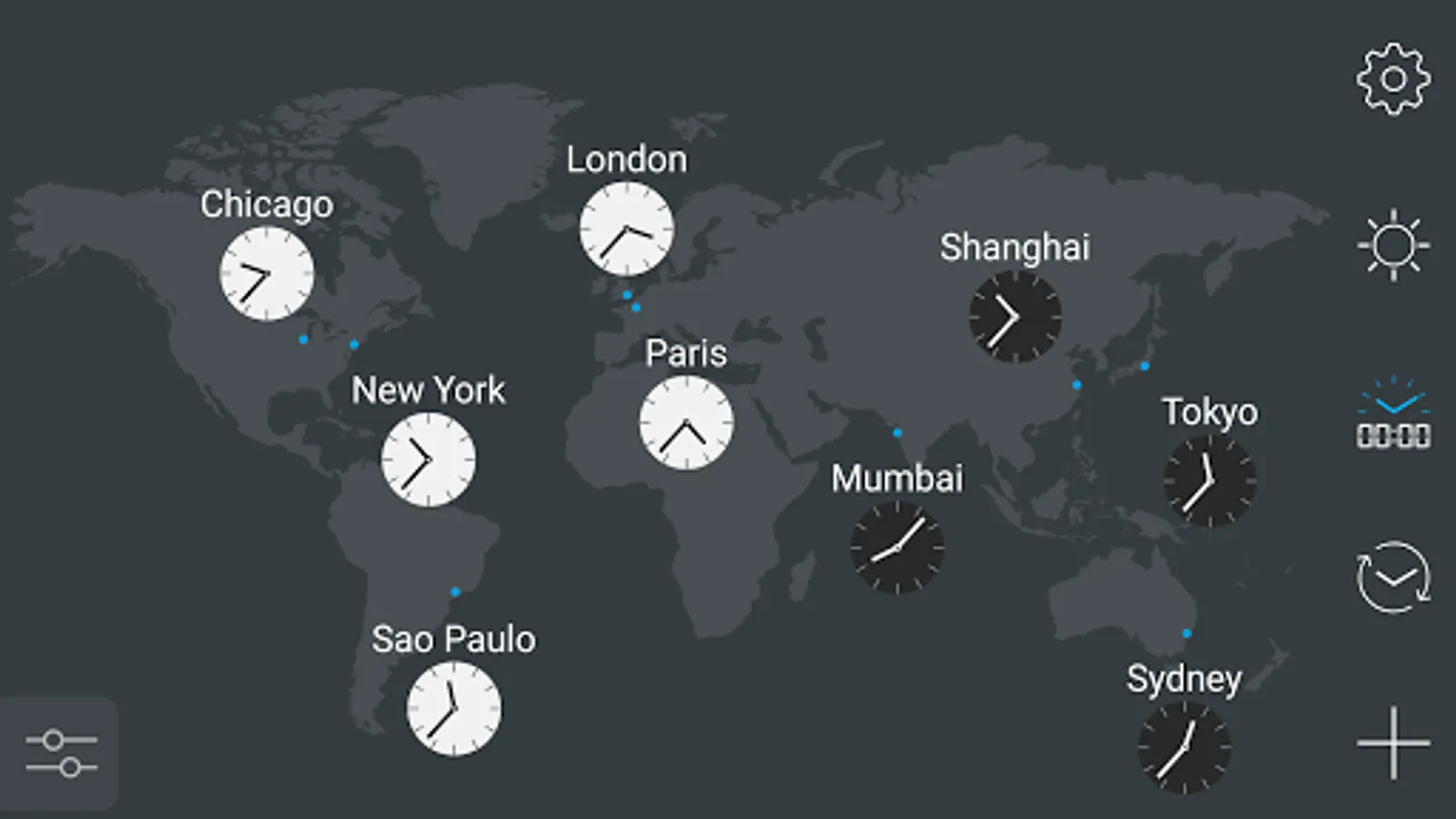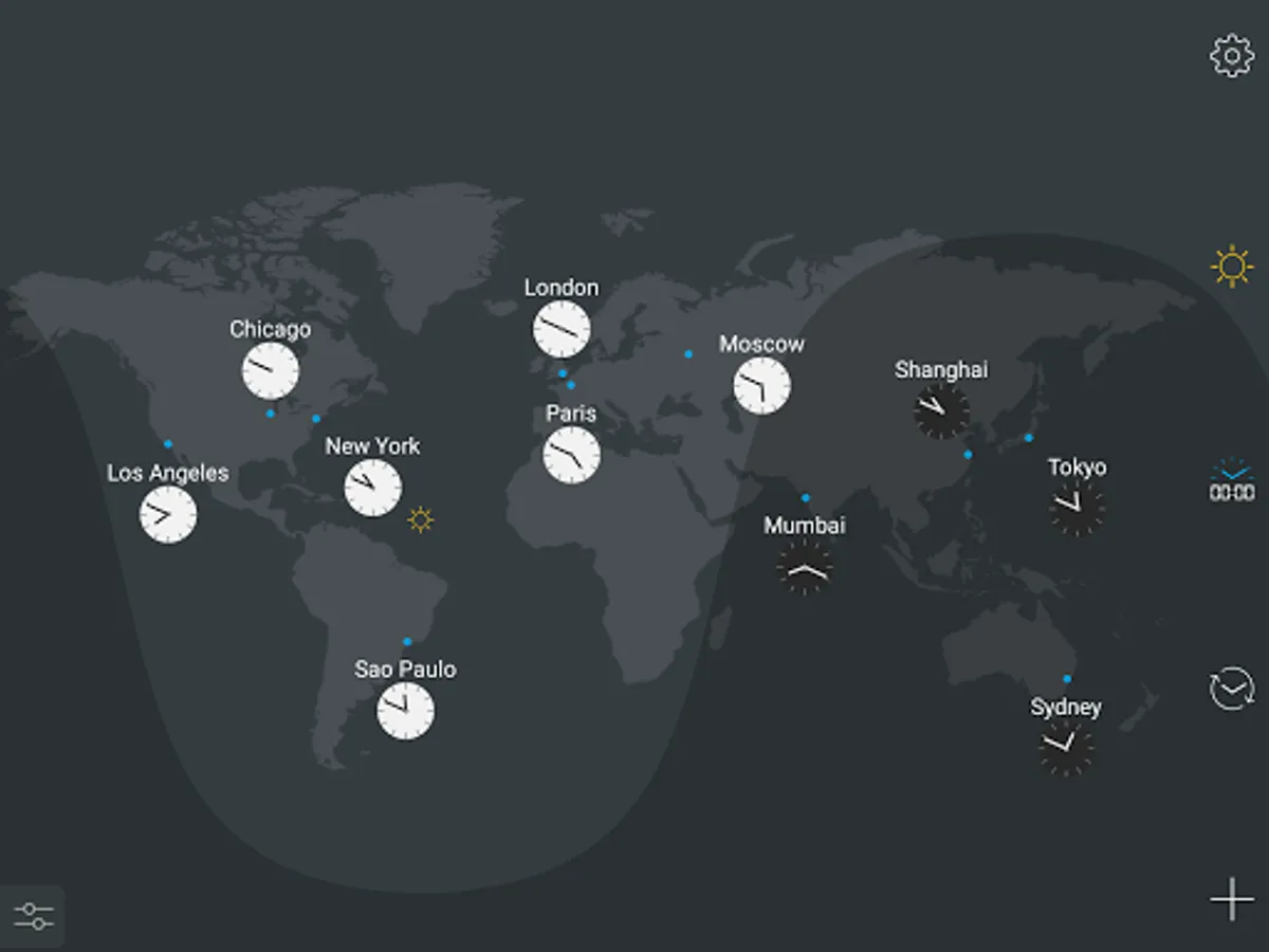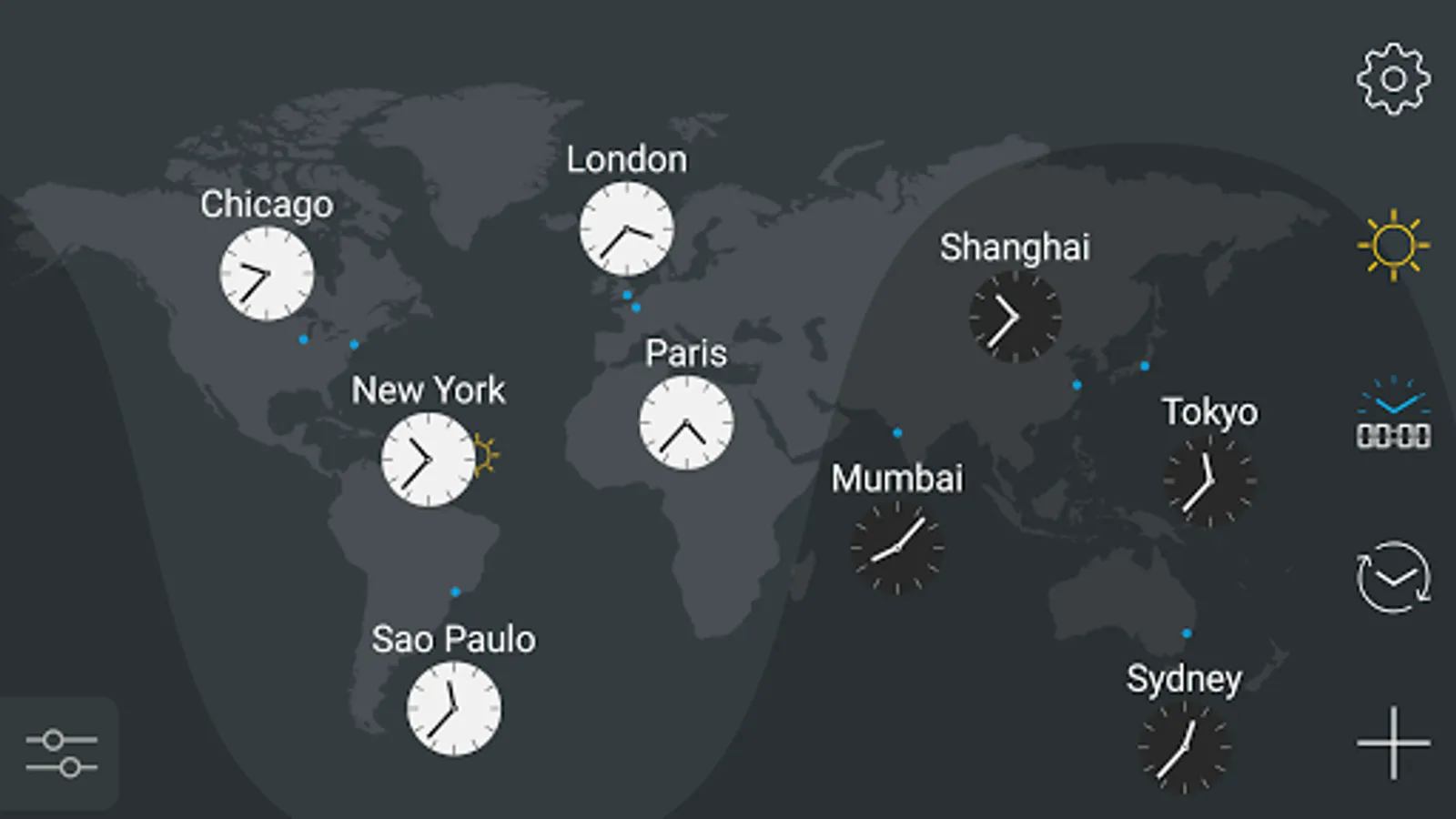 map:clock allows you to keep track of current time for major cities and time zones on a world map.
