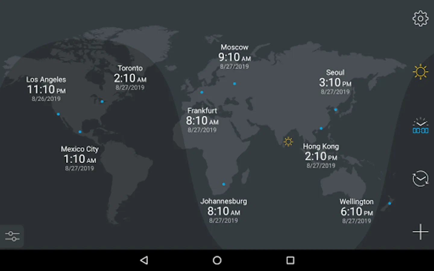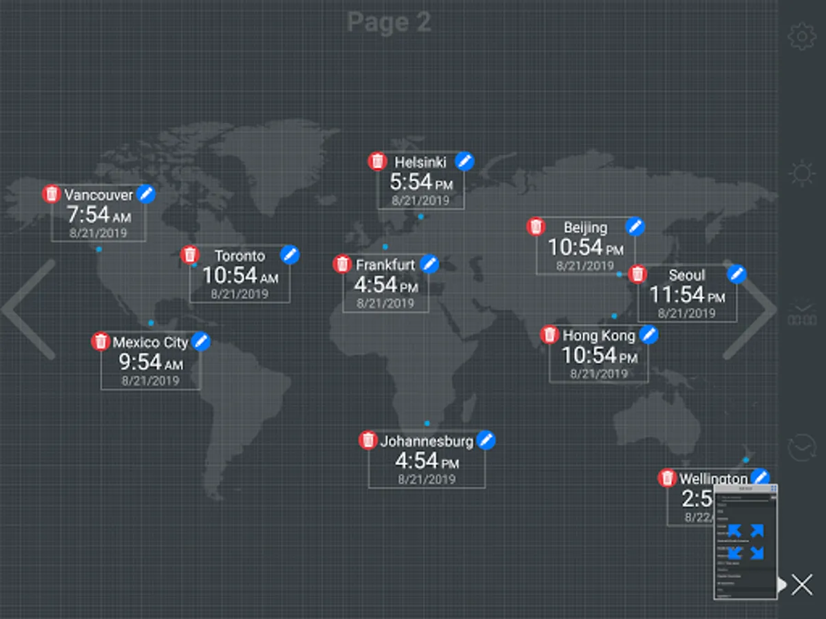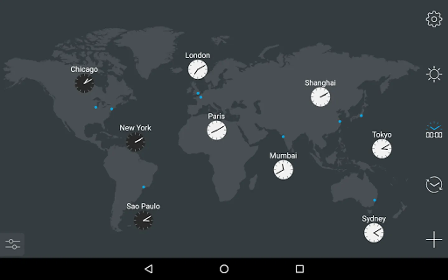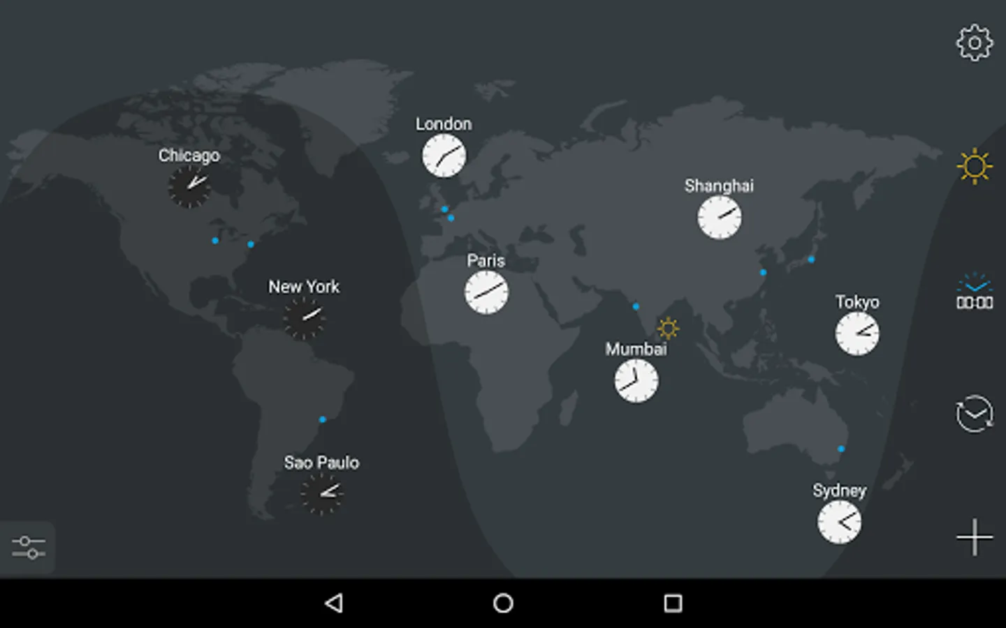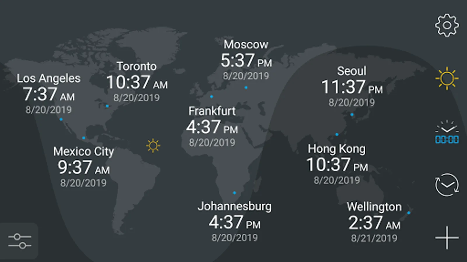 map:clock allows you to keep track of current time for major cities and time zones on a world map.