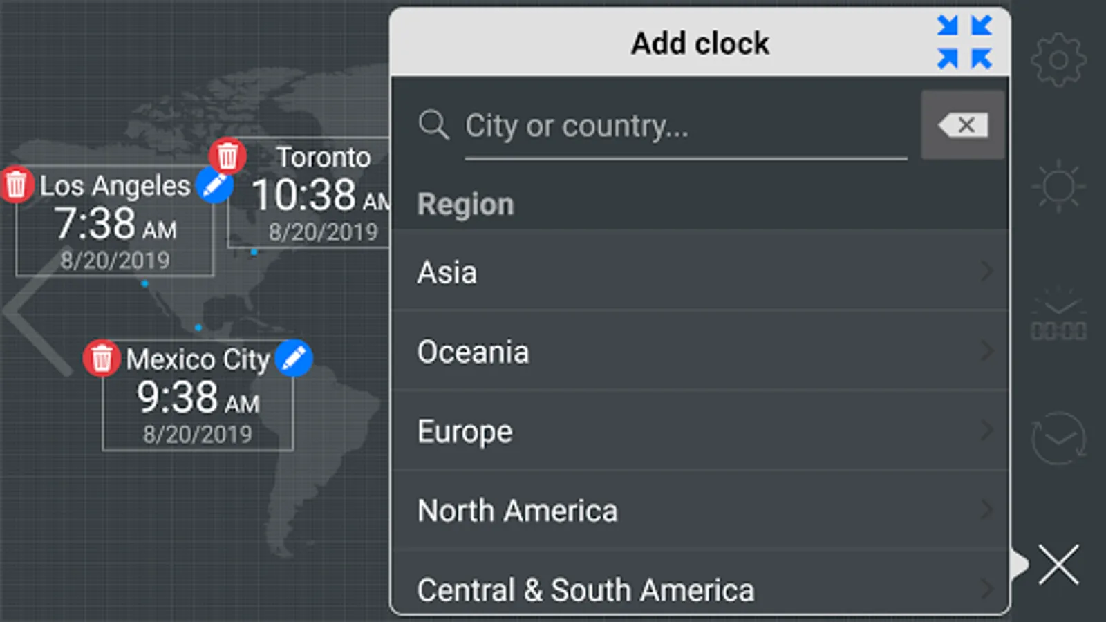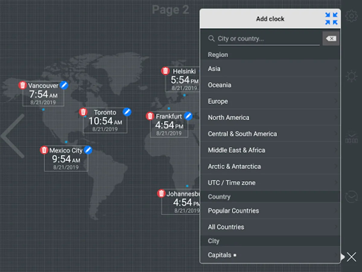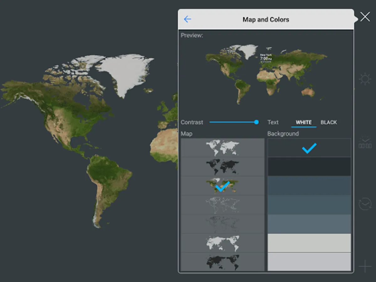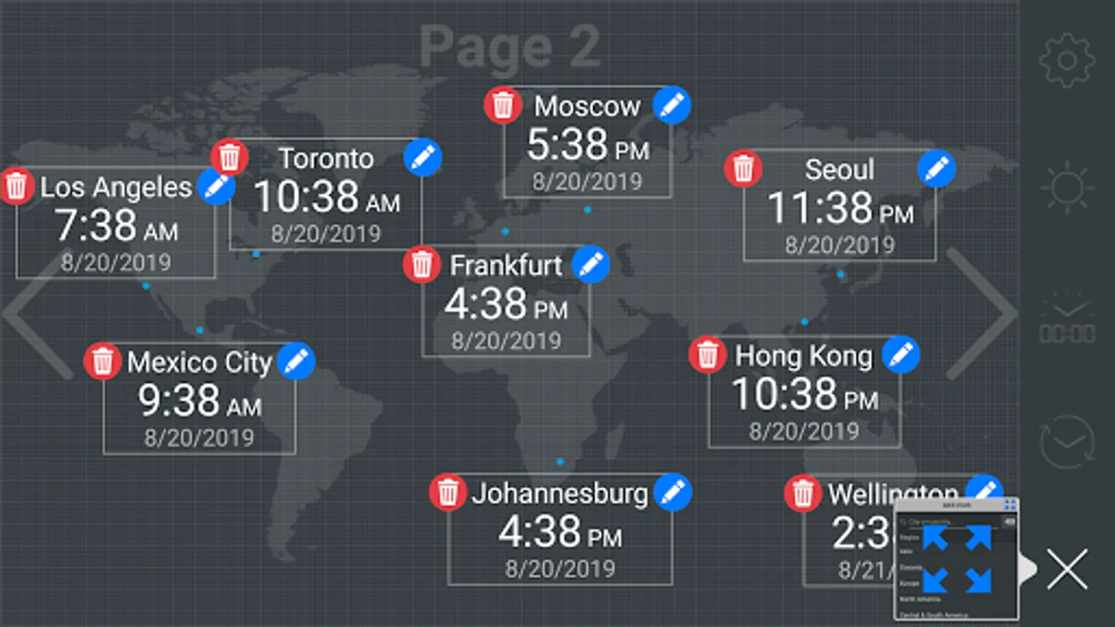 map:clock allows you to keep track of current time for major cities and time zones on a world map.
