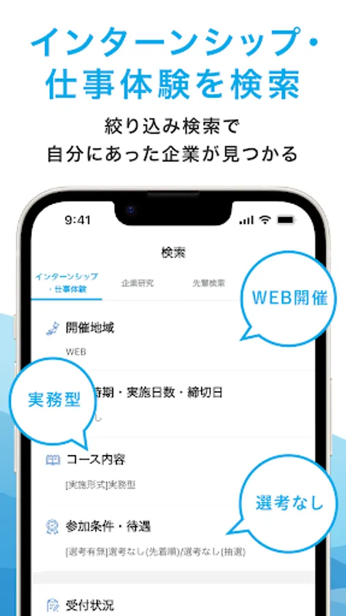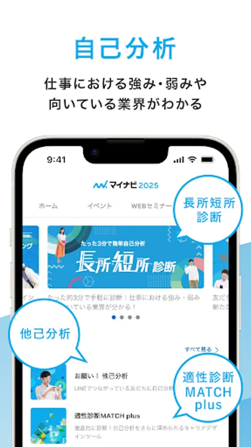 It is a 2025 version of [for students], a job hunting app with various useful contents such as self-analysis tools, aptitude tests, web test measures, as well as abundant information on internships and work experience!