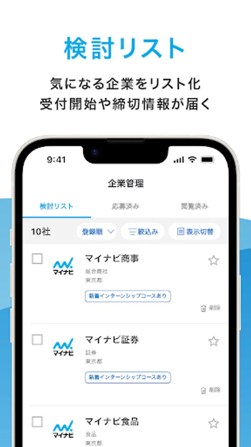 Use the function "Consideration list" that allows you to list companies you care about, and use it to list companies you want to apply for internships and work experience!