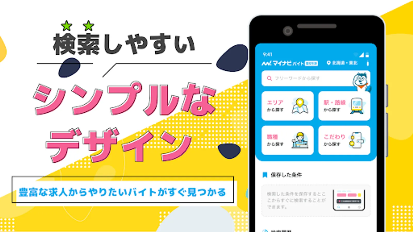 No membership registration required! [Mynavi Baito] Enjoy the speedy and efficient search for part-time jobs by using the convenient saving and application functions of the recruitment app!