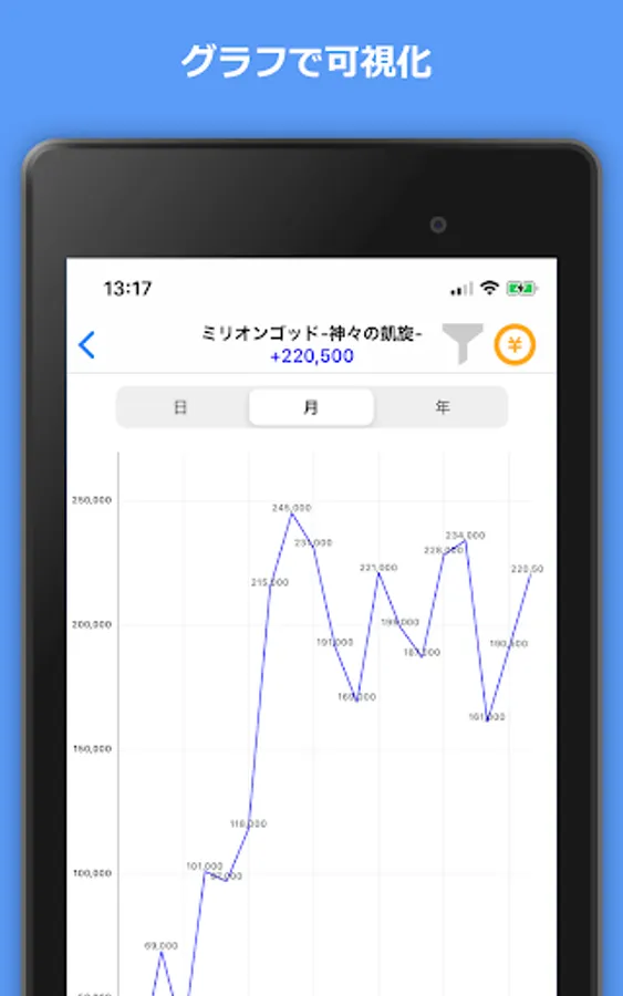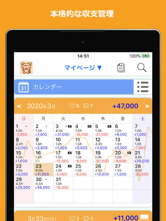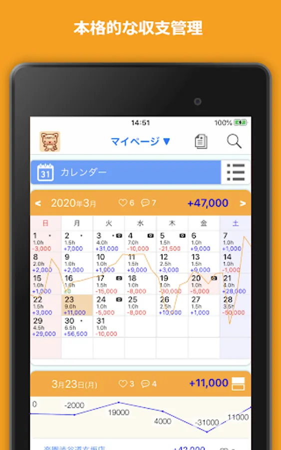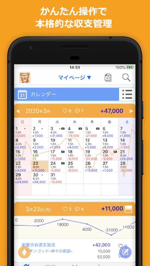 The easy-to-read calendar makes it easy to see the monthly balance. The monthly balance result graph is overlaid on the calendar.