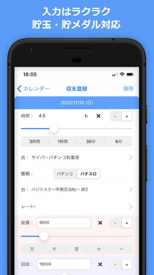 You can specify the exchange rate and enter the number of balls and the number of sheets. You can manage the income and expenditure in more detail. It can also be used as a memo for the number of balls and medals stored at each store.