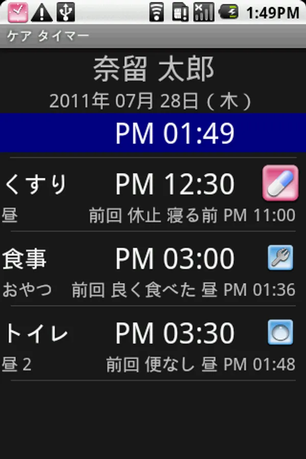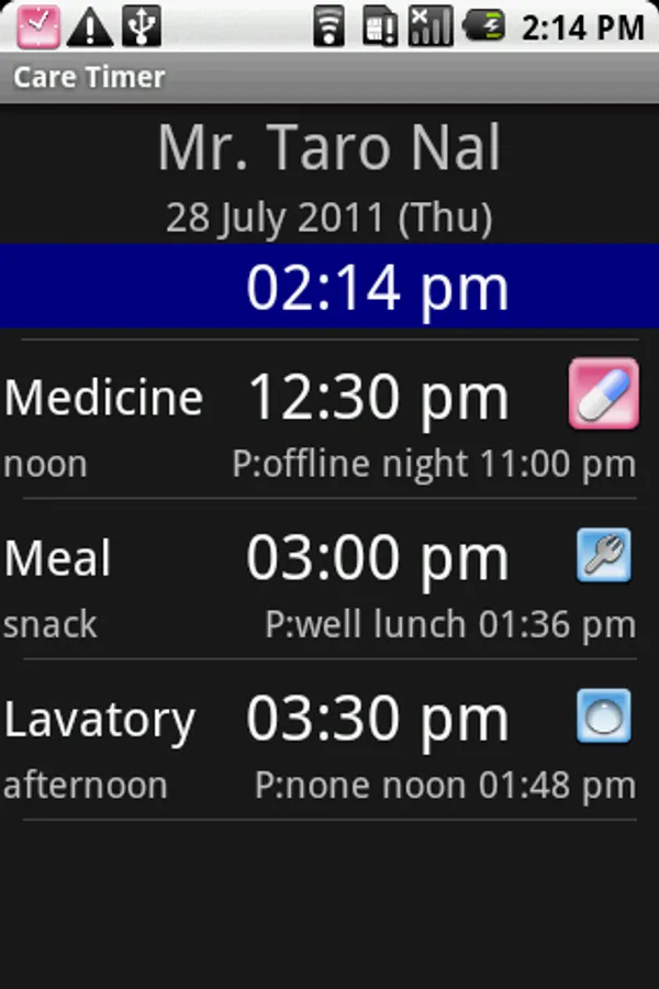 Notifies the time for Medicine, meal and lavatory.