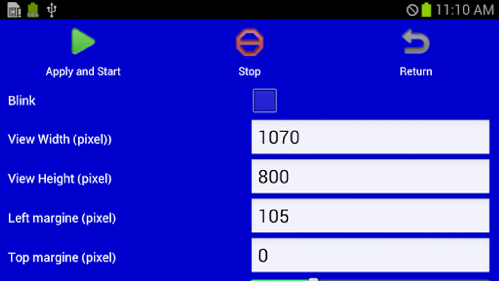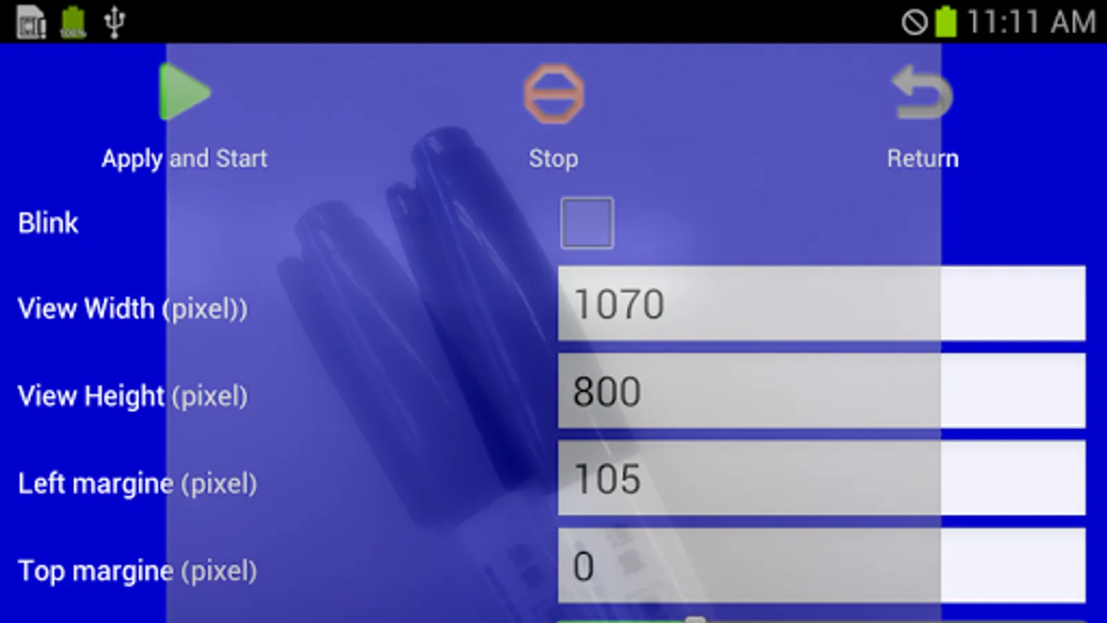 2) Adjust the display sizes and margins, and touch [Apply and Start] button, so that the overlay appears.