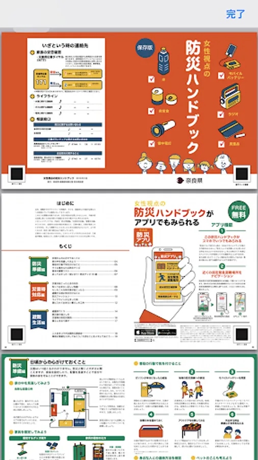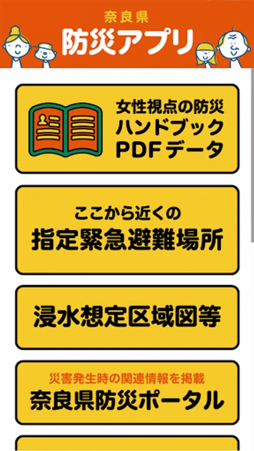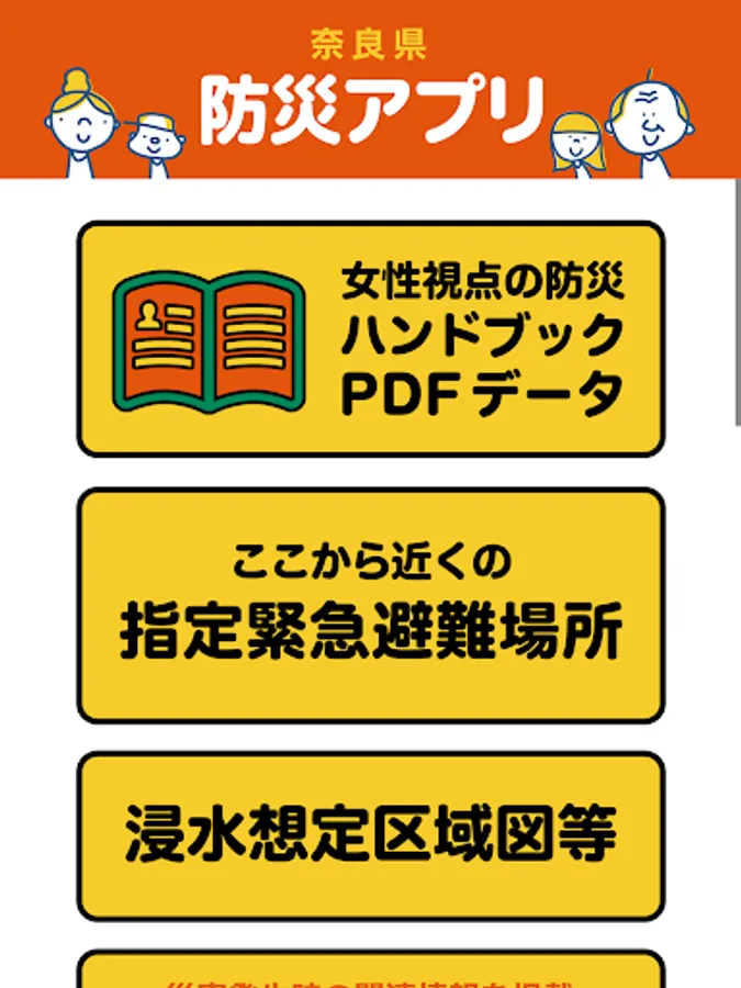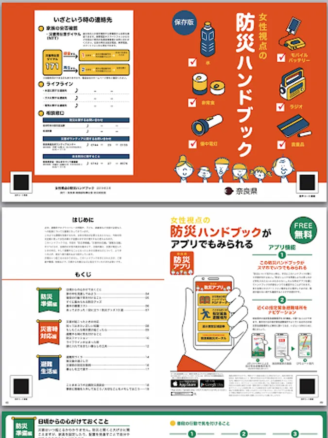 "Nara Prefecture Disaster Prevention Application" is an application that you can see "Disaster Handbook of Female Viewpoint" issued in Nara Prefecture. You can also use the AR function of the smart device to search for the designated emergency evacuation area in Nara Prefecture, which is close to your current location, and navigate to your destination.