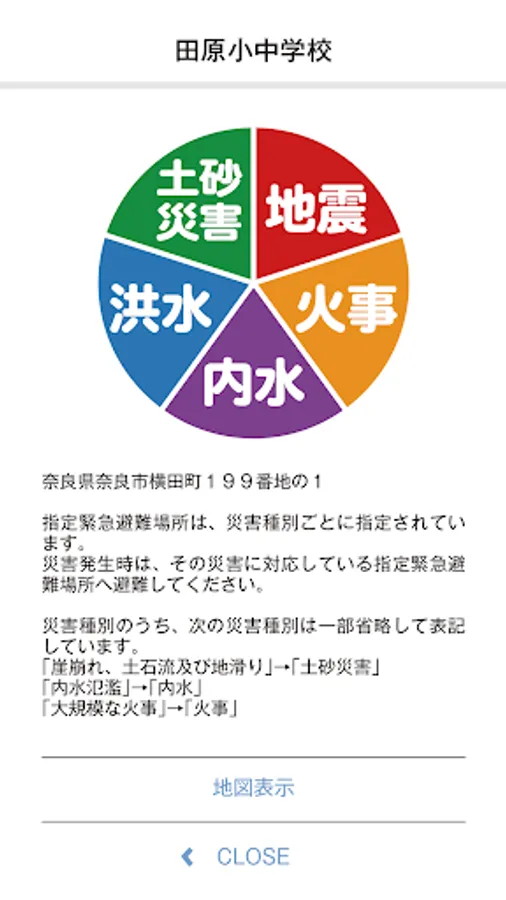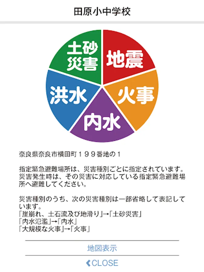 ※ This application is for confirming the evacuation site in advance in preparation for a disaster, so we can not guarantee the safety to the evacuation site. In the case of a disaster, we ask that you take refuge in a safe place by looking at the circumstances rather than just acting on this application's information.